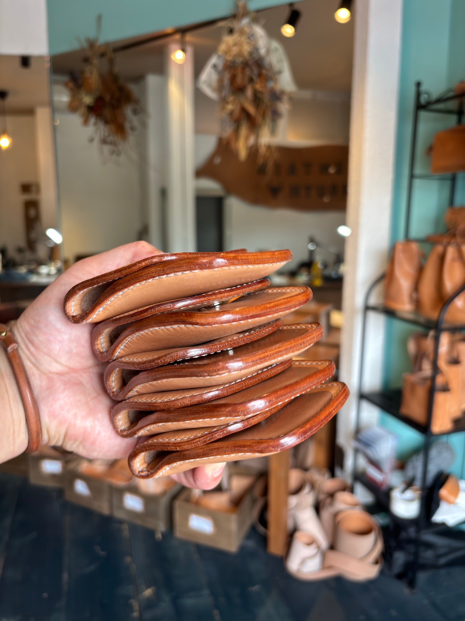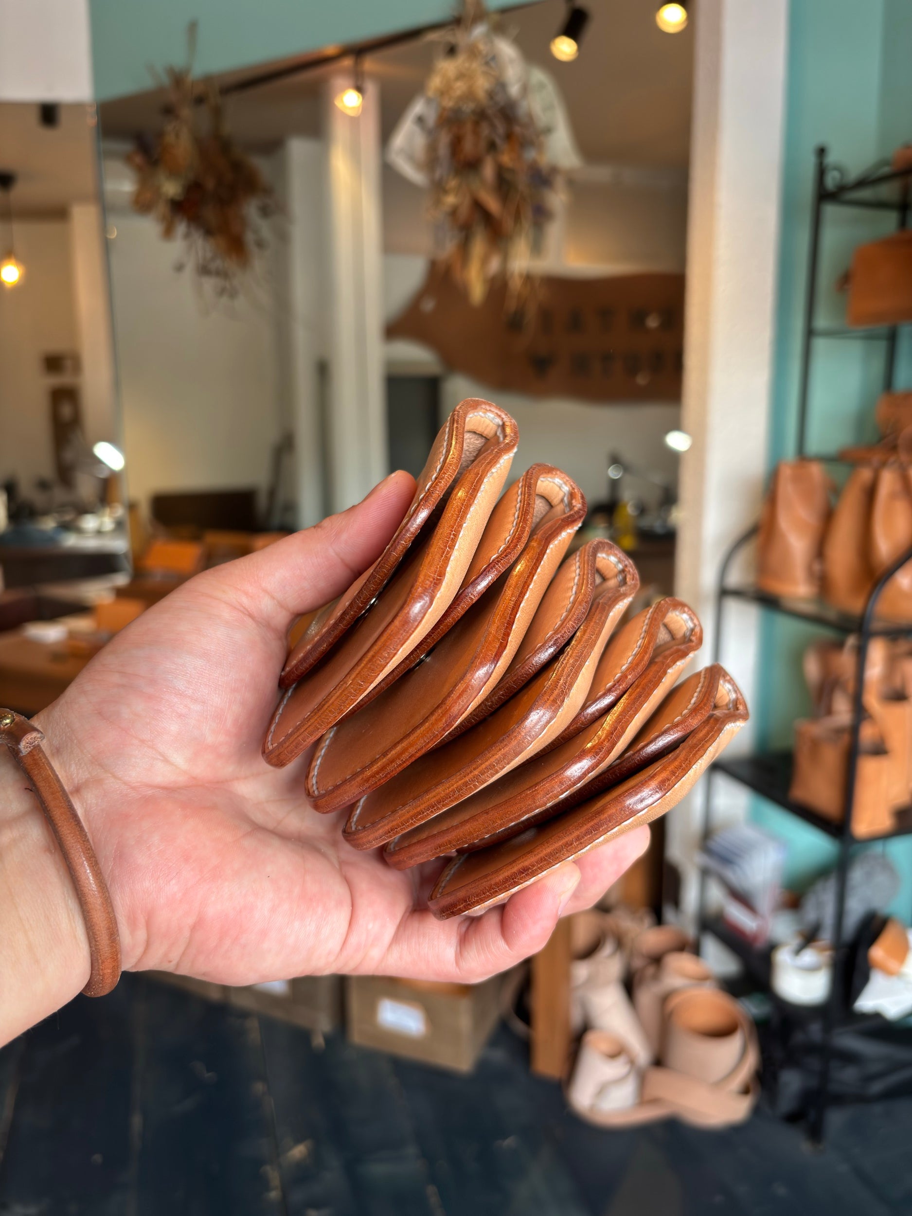 馬蹄形のようなフォルムに、ステッチも普通の縫い方ではなく、途中で逆転させることによって表からの見た目もまた雰囲気が出ています。