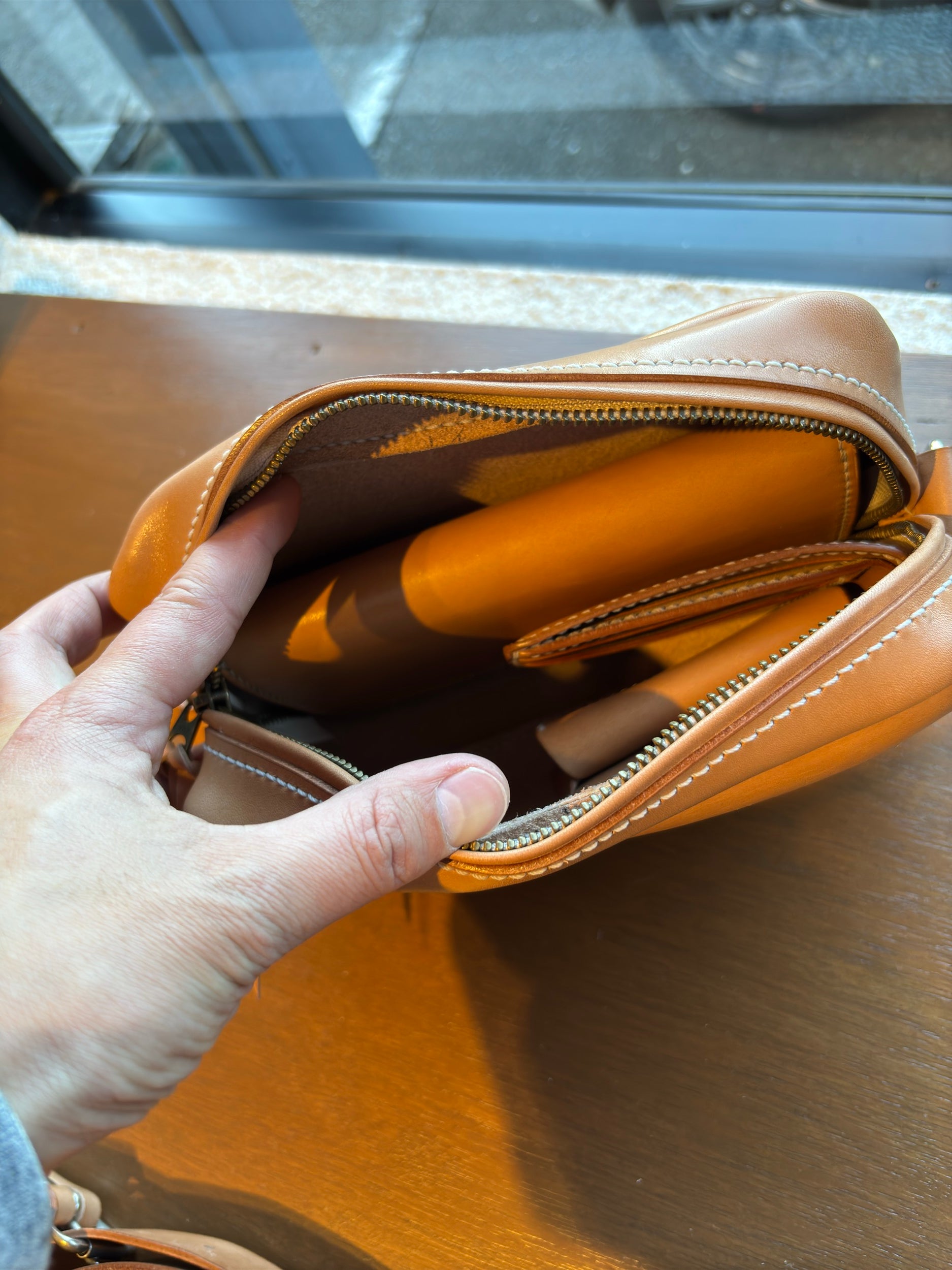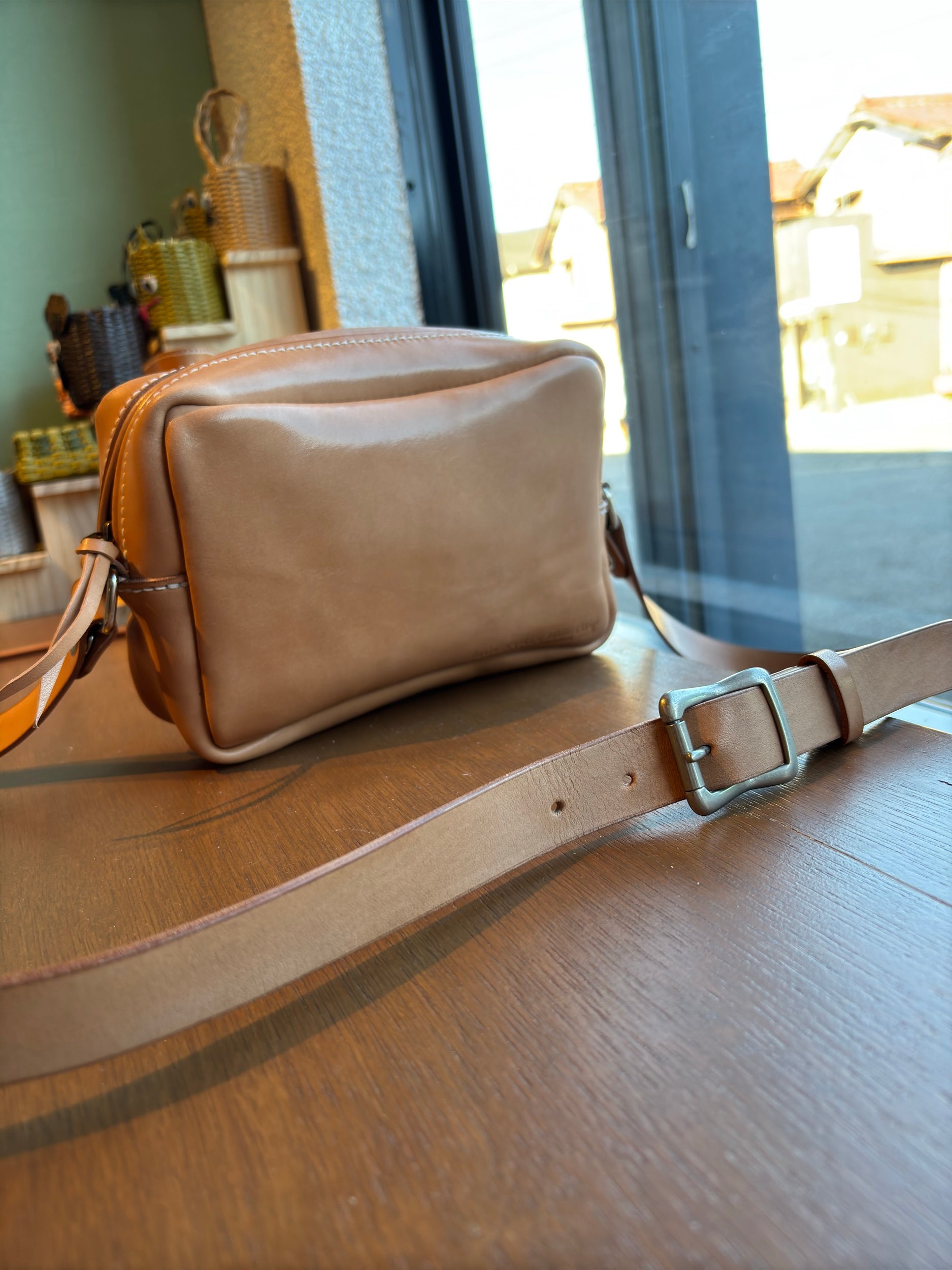 総手縫で仕立てた四角い形のショルダーバッグです。 財布、スマホを入れてもかなり余裕のある作りにしています。